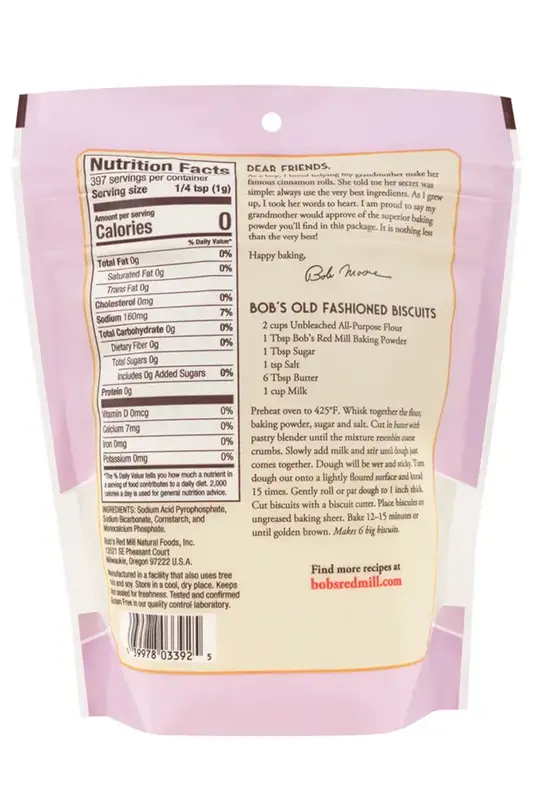 Bob's Red Mill Double Acting Baking Powder is a leavener used for baking. It releases carbon dioxide when exposed to moisture and heat, causing dough and batter to rise. It is gluten free and contains no added aluminum. Unlike many other baking powder brands that utilize sodium aluminum phosphate or sodium aluminum sulfate as the acid ingredient, our baking powder substitutes monocalcium phosphate and sodium acid pyrophosphate to create a superior double-acting baking powder without the metallic aftertaste. And like all our gluten free products, our natural baking powder is produced in our gluten free facility and batch tested to ensure its purity. Our baking powder is perishable and should be kept cool and dry.