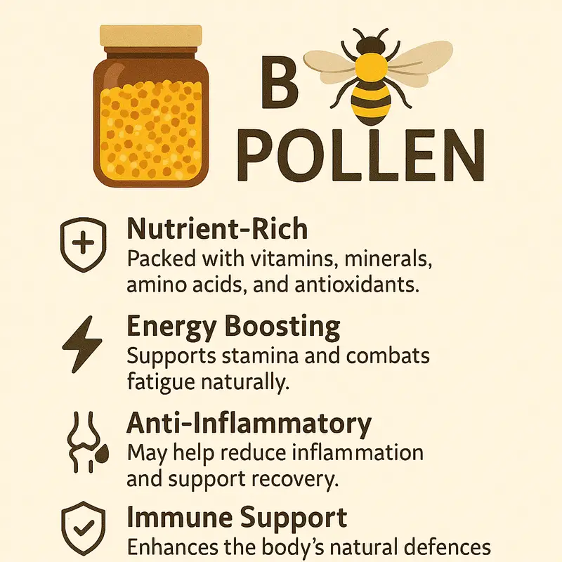 Bee pollen is highly regarded as a natural nutritional supplement that can be added to your morning breakfast cereal, smoothies, desserts or porridge. It is made by bees in the hives, as they roll the pollen into balls and stick it all together with honey and nectar. The bees also add other nutrients during the process such as enzymes, fungi and friendly bacteria. The bees use this pollen as their main source of protein.