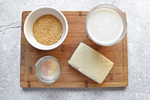 - Place tofu, 225ml soya drink, 1 tsp garlic powder, 1 tsp onion powder, 3 tbsp yeast flakes, and 0.5 tsp salt in a blender and blend until smooth.