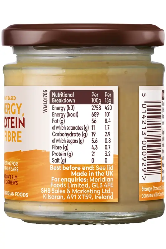 This cashew butter contains no added sugar or salt and is suitable for vegan and vegetarian diets.