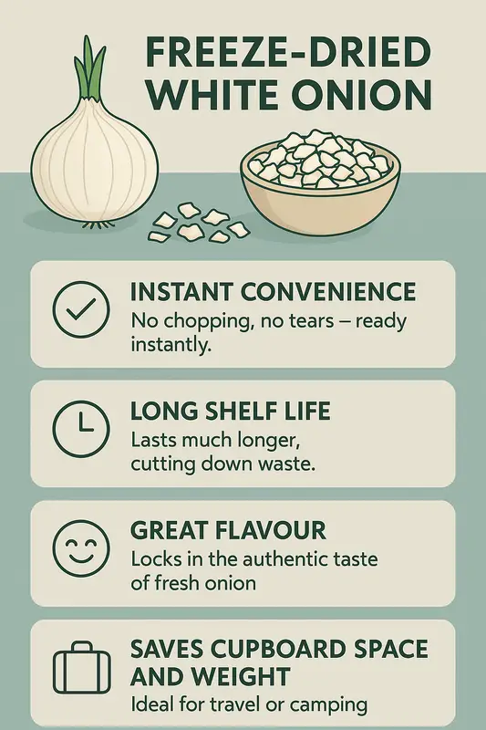 Superior Flavour: Our freeze-dried onions offer a robust, tangy taste that complements a variety of dishes, from soups and stews to casseroles and salads.