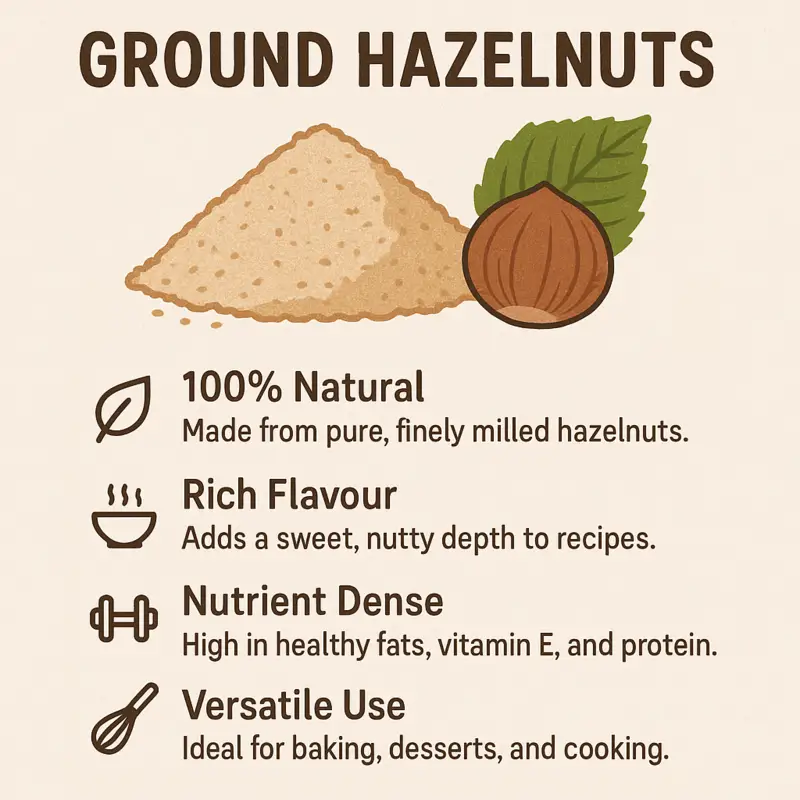 Naturally high in healthy fats, vitamin E, and plant-based protein, ground hazelnuts offer both taste and nutrition in every spoonful. Whether you're baking a classic torte or adding depth to a savoury dish, these finely milled nuts are a wholesome and flavourful choice.