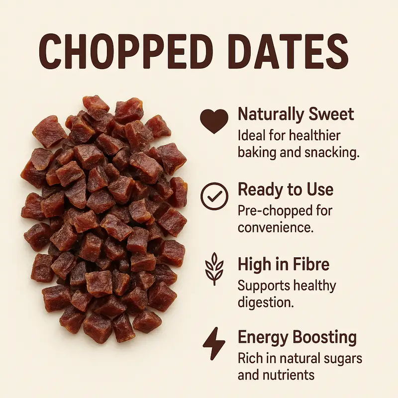 Organic chopped dates offer natural sweetness in a handy, easy-to-use format. Carefully coated with a touch of rice flour to prevent sticking, these soft, chewy pieces are perfect for everyday use in baking and snacking.