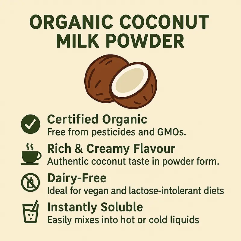 Our organic coconut milk powder is rich in healthy fats, vitamins, and minerals. It can be used as a dairy-free substitute in recipes that call for regular milk or cream. Simply mix the powder with water to create a creamy and flavourful coconut milk that can be used in curries, smoothies, desserts, and more.