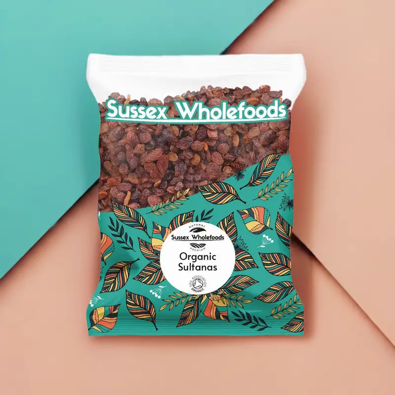 - Organic produce. Golden brown, medium sized organic sultanas.
