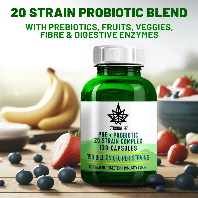 A daily prebiotic and probiotic blend designed to complement the natural balance of the gut microbiota. Vegan-friendly, filler-free formulation with multiple live bacterial strains.