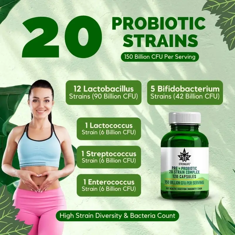 Microcrystalline Cellulose, Vegan Capsule Shell, 20 Probiotic Strains & Prebiotic Blend.