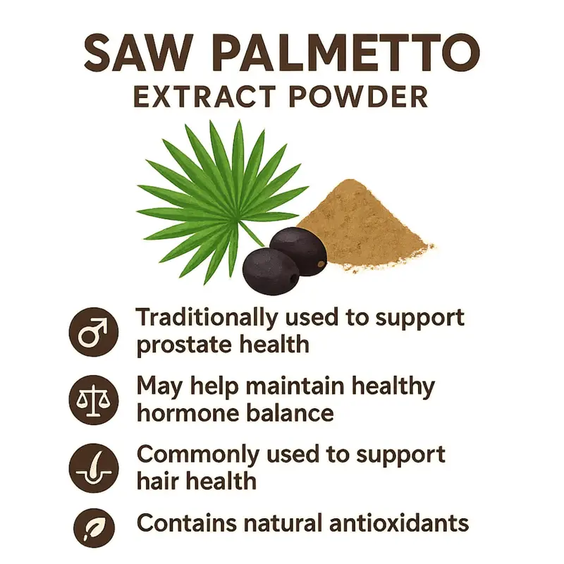Saw Palmetto Powder is a versatile and natural dietary supplement ingredient derived from the ground berries of the Serenoa repens plant. Known for its rich profile of bioactive compounds, including fatty acids and phytosterols, this powder is widely recognized for its health-supporting properties.