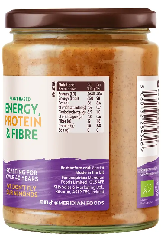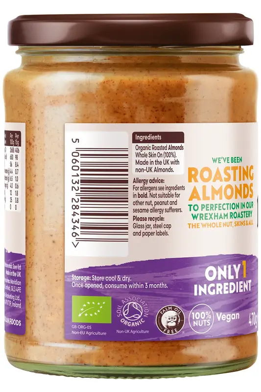 This almond butter contains no added sugar and is suitable for vegan and vegetarian diets.