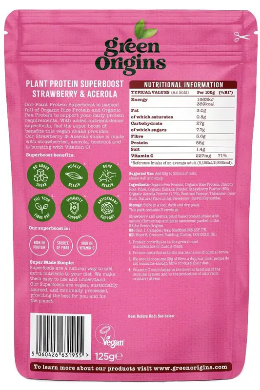 Our Plant Protein Superboost is packed with 10g of Organic Rice and Organic Pea Protein per serving and includes all 9 essential amino acids. By choosing our sustainably sourced, vegan shakes, you choose to protect animals and the planet. Our Strawberry & Acerola Superboost is creamy, sweet and bursting with Acerola for a fruity flavour and Vitamin C.