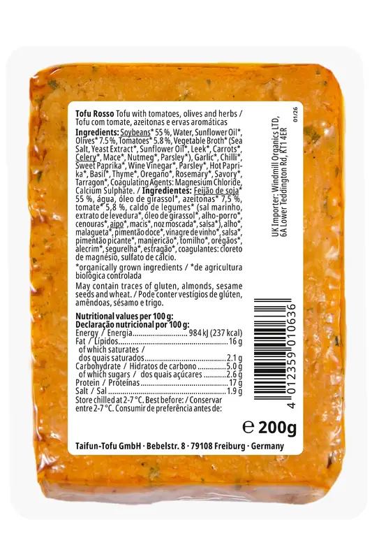 SOYBEANS* (55%), Water, Sunflower Oil*, Olives* (7.5%), Tomatoes* (5.8%), Vegetable Broth* (Sea Salt, Yeast Extract*, Sunflower Oil*, Leek*, Carrots*, CELERY*, Mace*, Nutmeg*, Parsley*), Garlic*, Chilli*, Sweet Paprika*, Wine Vinegar*, Parsley*, Hot Paprika*, Basil*, Thyme*, Oregano*, Rosemary*, Savory*, Tarragon*, Coagulating Agents: Magnesium Chloride, Calcium Sulphate *=Certified Organic Ingredients