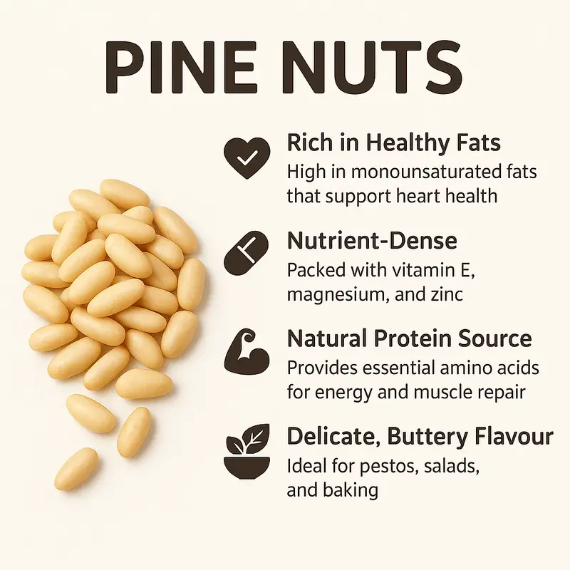 Whether blended into a classic pesto, scattered over roasted vegetables, or stirred into baked goods, these versatile seeds elevate your meals with a gourmet touch. With their nutrient-packed profile and satisfying crunch, pine nuts are a wholesome addition to any kitchen.