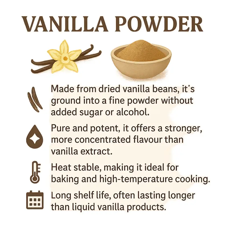 Our Grade A Vanilla Powder encapsulates the rich and enchanting essence of pure vanilla in a convenient, versatile form. With a small sprinkle of this product you can bring your recipes and drinks to a gourmet level. From delicate pastries and velvety ice creams to hearty sauces and tantalizing beverages, this exceptional ingredient adds depth and sophistication to both sweet and savoury dishes.