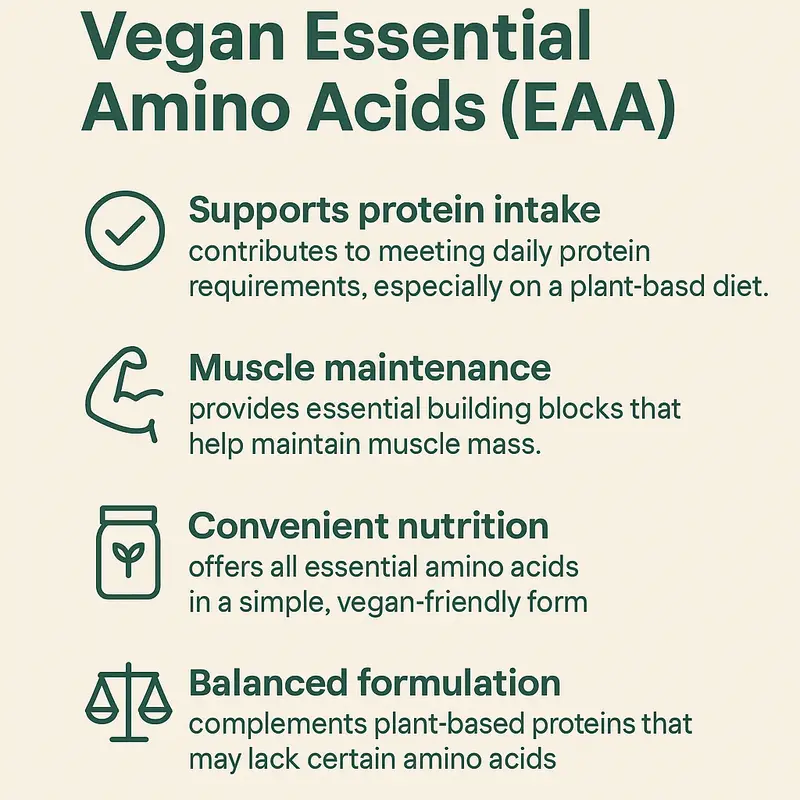 - Can be used to top up daily essential amino acid intake, especially for vegans, vegetarians, or those increasing physical activity.