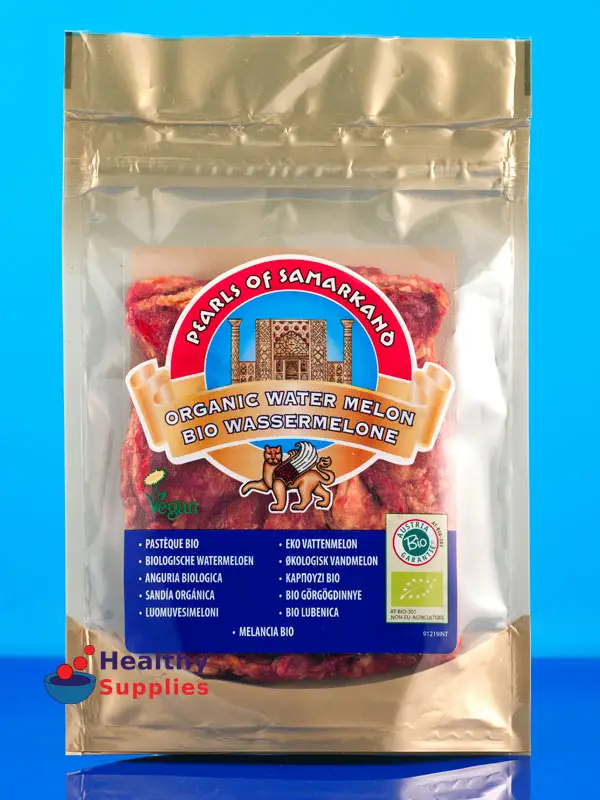 Dried water melon stays fresh for longer once opened thanks to the zip lock pouch. The bite-sized strips make a fantastic snack but can also be added to muesli, yoghurt and can be added to cake recipes.